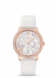 The Omega De Ville reference 424.57.37.20.55.003 is a traditional round wristwatch with an elegant, classic design. The red gold case measures 36.8mm across and has a diamond-set bezel. The white mother-of-pearl dial has a decorative butterfly design and nine diamond indexes in 18K red gold holders.