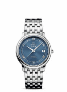 The Omega De Ville reference 424.10.37.20.03.002 is a traditional round wristwatch with an elegant, classic design. The stainless steel case measures 36.8mm across and holds the self-winding caliber 2500 movement with co-axial escapement. The blue dial is inspired by watches from Omega’s past.