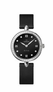 The Omega DeVille Dewdrop 424.17.27.60.51.001 has a stainless steel case with diamond-set bezel. Both dial and a black satin strap.