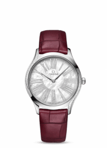 The Omega De Ville Trésor 428.58.36.60.55.001 features a case in Omega’s proprietary ‘Canopus’ white gold, with baguettes set into the top left and bottom right lugs. The dial is mother-of-pearl with diamond-set Roman hour markers.