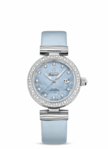 The Omega DeVille LadyMatic reference 425.37.34.20.57.003 has a stainless steel case with diamond-set bezel, which houses the self-winding caliber 8520. The blue mother-of-pearl dial is matched by a blue leather strap.