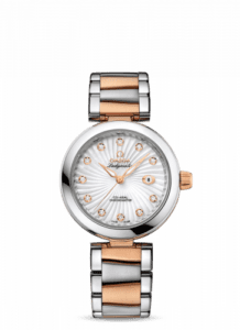 The Omega DeVille Ladymatic reference 425.20.34.20.55.001 has a stainless steel case with a red gold crown and a mother-of-pearl dial with diamond indexes. It is fitted with a stainless steel and red gold bracelet.