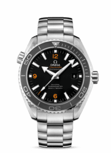 The Omega Seamaster Planet Ocean reference 232.30.46.21.01.003 has a stainless steel case of 45.5mm and a matching stainless steel bracelet. Its black dial features bright orange numerals. This watch is powered by the caliber 8500 movement.