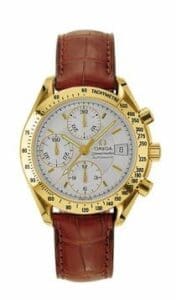 The Omega Speedmaster Date reference 3613.30.02 features a yellow gold case and a silver dial. It is presented on an alligator strap.