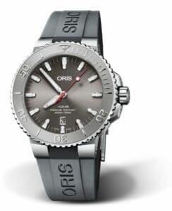 The Oris Aquis Date Relief (reference 01 733 7730 4153-07 4 24 63EB) has a grey dial inspired by the color and feeling of water. It was created in partnership with swimmer and water ambassador Ernst Bromeis.