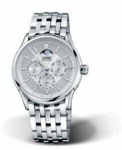 The Oris Artelier Complication 01 581 7592 4051-07 8 21 73 has a case of 40.00mm, which houses a caliber Oris 581 – a self-winding movement with full calendar and moonphase indicator. The dial is Silver.