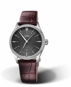 The Oris Artelier Date 01 561 7724 4953-07 5 17 63FC has a case of 33.00mm with diamond-set bezel, which holds the self-winding caliber Oris 561 – of course fitted with the brand’s signature red rotor. The dial is Grey, with diamonds at the hours.