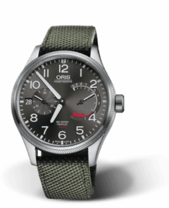 The Oris Big Crown ProPilot Calibre 111 was introduced in 2015 as pilot’s watch that brings together the company’s landmark in-house developed Calibre 111 movement with its iconic Big Crown ProPilot family. The 111 calibre has enough power for 10 days of autonomous running.The bezel is coin-edged and has a big crown. The dial features a patented non-linear power reserve indication and small seconds and date at 9 o’clock. Reference 01 111 7711 4163-Set 5 22 14FC is fitted with a green textile strap. The dial is anthracite and has Arabic numerals.