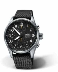 The Oris Big Crown ProPilot Chronograph gets it’s power from the Calibre 744 automatic movement with about 48 hours of power reserve. Some features are a chronograph, and a date, hour, minute, and small second displays. The bezel is coin-edged, a design element inspired by the turbines of a jet engine, and has an oversized crown, so it is possible to make quick adjustments. The tips of the chronograph hands are in yellow.Reference 01 774 7699 4134-07 5 22 15FC is fitted with a black textile strap. The dial is black and has Arabic numerals.