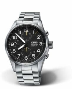 The Oris Big Crown ProPilot Chronograph gets it’s power from the Calibre 744 automatic movement with about 48 hours of power reserve. Some features are a chronograph, and a date, hour, minute, and small second displays. The bezel is coin-edged, a design element inspired by the turbines of a jet engine, and has an oversized crown, so it is possible to make quick adjustments. The tips of the chronograph hands are in yellow.Reference 01 774 7699 4134-07 8 22 19 is fitted with a stainless steel strap. The dial is black and has Arabic numerals.