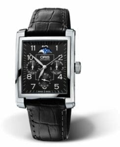 The Oris Rectangular Complication 01 582 7658 4034-07 5 23 71FC has an rectangular case of 33.00*46.00mm, which houses a caliber Oris 582 – a self-winding movement with central seconds, full calendar, and moonphase indicator. The Black dial has Arabic Numerals.