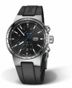The Oris Williams Chronograph 01 774 7717 4154-07 4 24 50FC has a stainless steel case crowned by a bezel with engraved tachymeter scale. This watch is powered by caliber Oris 774, an automatic movement with chronograph and date.