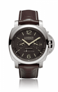 Introduced in 2010, the PAM 365 houses what is one of Panerai’s most impressive movements when it comes to complications. The case measures an impressive 50mm across and is done in titanium. It features a brown sandwich dial.Sunrise and sunset are displayed through openings in the outer rim on the lower half of the dial. The equation of time is shown via a linear display at 6. The month is displayed through a hand at 3.