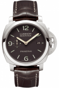 The PAM00351 features a 44mm Luminor 1950 case in brushed titanium, a brown dial and gold hands. It is powered by caliber P.9000. This watch was first introduced in 2010.