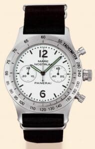 The PAM 007 is the white dial version of the Vendome-era Mare Nostrum.It is powered by a hand-wound movement by ETA with chronograph module by Dubois-Depraz.