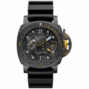 The Panerai Luminor Submersible PAM01324 is a limited edition of 162 pieces created in collaboration with the Navy Seals. This watch has a ‘Carbotech’ case and bezel, paired with a brushed titanium case back. This watch is powered by caliber P.9010/GMT.