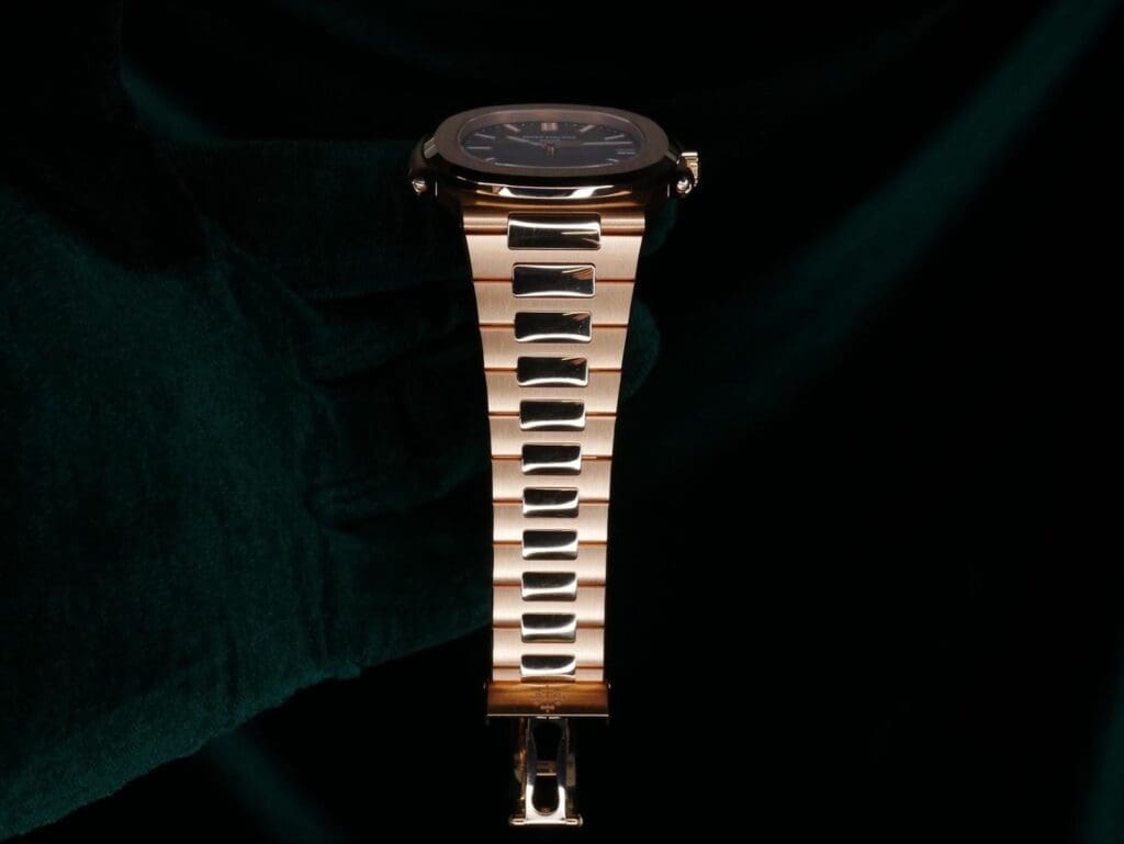 Compared to other solid gold sports models, like the Royal Oak or Vacheron Constantin Overseas, this Nautilus feels more compact and less showy. That’s partly due to the caseback and end link design, which help it sit flatter on the wrist.