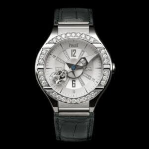 The Piaget Polo Tourbillon Relatif Diamond reference G0A31148 has a White Gold case with a diameter of 45.00mm. Inside ticks the caliber 608P. The dial is Silver.