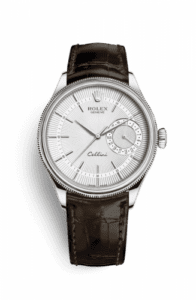 The Cellini Date models add a date function via a hand on a small sub‑dial, blending practicality and elegance.All the new Cellini models feature a high-precision self-winding mechanical movement, certified as a chronometer and entirely manufactured by Rolex. In the purest traditional style, these watches are available only with shiny black or brown alligator leather straps stitched, remborded and with an 18 ct gold buckle; a fitting reward for the sheer elegance of a gentleman.The Cellini Date model is offered in four versions: with a black or silver dial featuring a “rayon flammé de la gloire” guilloche motif, and with a 39 mm case in a choice of 18 ct white or Everose gold. It is fitted on a remborded and stitched alligator leather strap with large scales, in shiny black or brown depending on the model, and with an 18 ct gold buckle matching the gold of the case.