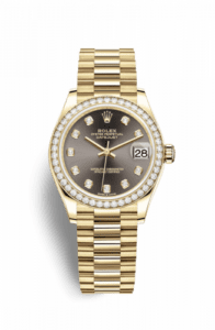 The updated Rolex Datejust 31 was introduced in 2018 in either rose, white or yellow gold – all powered by the new caliber 2236. The two tone ‘Rolesor’ variations were added to the collection one year later.Ref. 278288rbr has a yellow gold case with a diamond-set bezel. It is available with a number of different dials and can be fitted with either an Oyster or President bracelet.