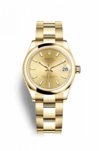 The updated Rolex Datejust 31 was introduced in 2018 in either rose, white or yellow gold – all powered by the new caliber 2236. The two tone ‘Rolesor’ variations were added to the collection one year later.Ref. 278248 has a yellow gold case with a domed, smooth bezel. It is available with a number of different dials and can be fitted with either an Oyster or President bracelet.