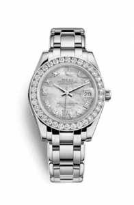 The Pearlmaster is a sub-collection within the Datejust family dedicated to jewelry watches, only available in precious metals with the addition of diamonds or other gemstones and fitted with the dedicated ‘Pearlmaster’ bracelet. In its present configuration, the Oyster case measures 34mm across. This watch is powered by the ‘Perpetual’ caliber 2235.