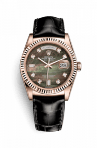 The Rolex Oyster Perpetual Day-Date is an iconic watch that hardly needs an introduction. Only ever available in precious metals (save for a few prototypes), it was for many years the undisputed king of the Rolex collection and the singular most recognizable ‘expensive’ watch to the general public. In its present form, the case measures the traditional 36mm. It is driven by caliber 3155.Reference 118135-0070 has an Everose case and a black mother-of-pearl dial. It is fitted with a leather strap.