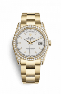 The Rolex Oyster Perpetual Day-Date is an iconic watch that hardly needs an introduction. Only ever available in precious metals (save for a few prototypes), it was for many years the undisputed king of the Rolex collection and the singular most recognizable ‘expensive’ watch to the general public. In its present form, the case measures the traditional 36mm. It is driven by caliber 3155.Reference 118388-0187 has a yellow gold case with diamond-set bezel and lugs, and a white dial.