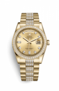 The Rolex Oyster Perpetual Day-Date is an iconic watch that hardly needs an introduction. Only ever available in precious metals (save for a few prototypes), it was for many years the undisputed king of the Rolex collection and the singular most recognizable ‘expensive’ watch to the general public. In its present form, the case measures the traditional 36mm. It is driven by caliber 3155.Reference 118348-0029 features a yellow gold case with diamond-set bezel. The center links of the President bracelet are diamond set as well.