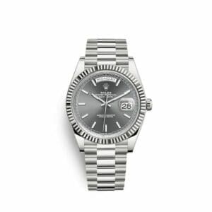 Introduced at BaselWorld 2015, the Day-Date 40 leads in a new era in the history of this Rolex icon. The case measures 40.00mm across, housing the self-winding caliber 3255. With reference 228239-0060, it is fabricated out of White Gold. The dial is Grey. This version was added to the collection in 2021.