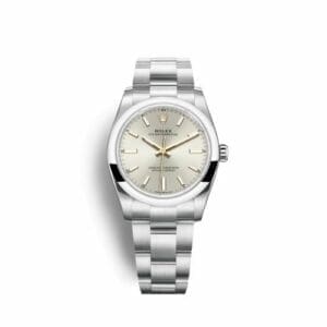 The Rolex Oyster Perpetual 34 reference 124200-0001 was introduced in 2020. This watch has a Stainless Steel case of 34.00mm, which holds the self-winding caliber 2232. The dial is Silver.