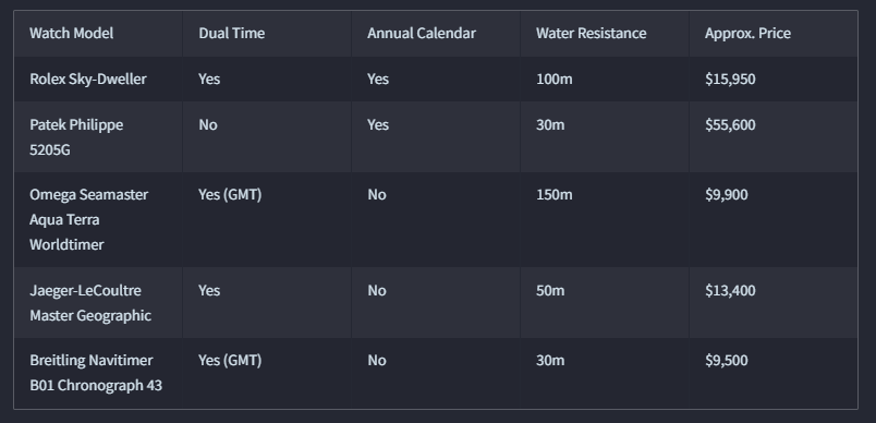 Within the competitive landscape of luxury dual time zone watches, the Sky-Dweller occupies a unique position through its combination of complications and heritage. While Patek Philippe’s annual calendar offerings exceed the Sky-Dweller in finishing complexity and hand-decoration, they command significantly higher price points starting at nearly double the Sky-Dweller’s retail value. Conversely, dual time zone watches from Omega and Breitling offer similar functionality at lower price points but lack the annual calendar function entirely.
