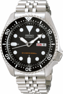 The SKX007K1 has a 42mm stainless steel case and is fitted a stainless steel bracelet. It has a black dial and the bezel is also black.