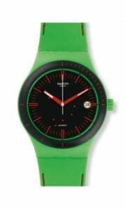 The Swatch Sistem Frog SUTG401 was introduced as part of the 2016 collection. Both case and strap are green, while the dial is black.
