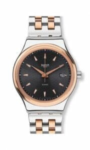 The Swatch Sistem Arrow was introduced in 2016 as part of the first Sistem 51-powered watches with an ‘Irony’ stainless steel case. In this case both case and bracelet are partially PVD coated in rose gold.