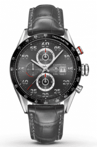 The TAG Heuer Carrera 1887 shown here pairs the Calibre 187 movement to looks best known of the Calibre 16 Carrera’s. The case is stainless steel; the bezel insert is ceramic rather than aluminium. Ref. CAR2A11.FC6313 has a grey dial.