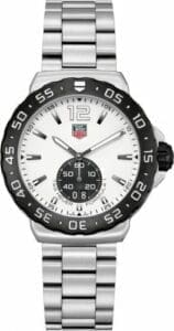 This TAG Heuer Formula 1 has a stainless steel case of 42mm, which houses a quartz movement with small seconds and big date. The dial is white.