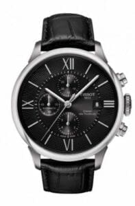 The reference T0994273603800 has a stainless steel case and a black dial. It is fitted with a matching leather strap. This watch is powered by the self-winding caliber C01.211 chronograph movement.