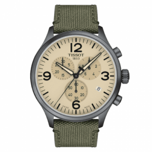 The Tissot Chrono XL is an oversized wristwatch with chronograph. The case measures 45mm across; it holds a quartz movement by ETA with chronograph and date. It comes in a variety of styles. As pictured, the Chrono XL has a case with grey PVD-coating and a beige dial.