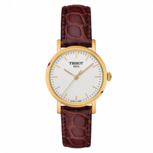 The Tissot Everytime Small has a case with a modest diameter of 30mm, which holds a quartz movement by ETA. It is available in a number of variations. Reference T109.210.36.031.00 has a yellow gold PVD-coated case and a silver dial.