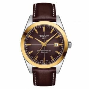 The Tissot Gentleman T927.407.46.291.01 is a stainless steel watch with a solid yellow gold bezel. It is powered by a Powermatic 80 movement with silicon balance spring. The dial is Brown.