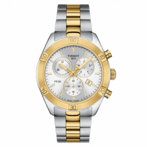 The Tissot PR 100 Sport Chic Chronograph has a 38mm case with a fixed bezel calibrated for 60 units. Inside ticks away an ETA G15.212 AB movement. Reference T101.917.22.031.00 has both case and bracelet partially PVD-coated in yellow gold. The dial is Silver.