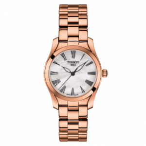 The Tissot T-Wave reference T112.210.33.113.00 has a stainless steel case of 30.00mm, which houses a caliber movement. The dial of this ladies wristwatch is White mother-of-pearl. Both case and bracelet are PVD-coated in rose gold.