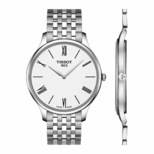 The Tissot Tradition 5.5 is an elegant dress watch. The slender case has a diameter of 39mm at a height of only 5.15mm. It houses a quartz movement by ETA which indicates the hours and minutes.Ref. T063.409.11.018.00 has a white dial. It comes on a stainless steel bracelet.