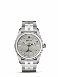 The Tudor Glamour Date is a retro-chic, versatile watch that is available in a great number of configurations. The case, either in full stainless steel or with touches of yellow gold, comes in 36, 31 and 26 millimeters. The largest is powered by the ETA 2824 movement, while the two smaller sizes are motivated by the ETA 2671.Reference M53000-0007 has a 31mm stainless steel case and a silver dial with a jacquard pattern.