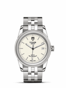 The Tudor Glamour Date is a retro-chic, versatile watch that is available in a great number of configurations. The case, either in full stainless steel or with touches of yellow gold, comes in 36, 31 and 26 millimeters. The largest is powered by the ETA 2824 movement, while the two smaller sizes are motivated by the ETA 2671.Reference M55000-0103 has a 36mm case in stainless steel paired with an opaline dial.