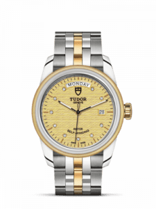 The TUDOR Glamour Day + Date features a 39mm case. It is powered by the self-winding caliber 2834. The dial displays the day at 12 o’clock, while a cut-out for the date is found at 3.Reference M56003-0004 has a stainless steel case with yellow gold bezel and crown. It features a champagne dial with a jacquard pattern.