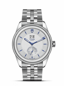 The Tudor Glamour Double Date is the first Glamour to be fitted with an in-house movement, which can be admired through a see-through case back. This brand-new, high-tech movement can be admired through the see-through case of the 42mm case, which is available in either full stainless steel or with a touch of gold.The Tudor Glamour Double Date M57100-0001 has a stainless steel case of 42mm. The silver dial features blue indexes and a set of blue hands.