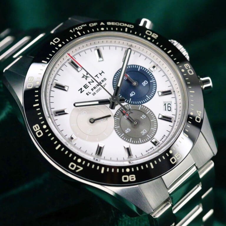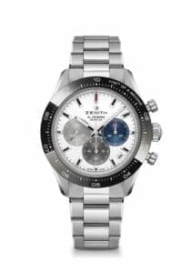The Zenith Chronomaster Sport reference 03.3100.3600/69.M3100 was introduced in 2021. The stainless steel case measures 41.00mm across and is crowned by a ceramic bezel. Power comes from the self-winding caliber El Primero 3600, with a central seconds hand for the chronograph making a full round in 10 seconds (‘Striking Tenth’). The dial is Silver.